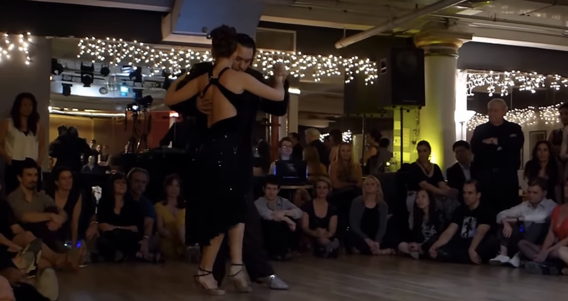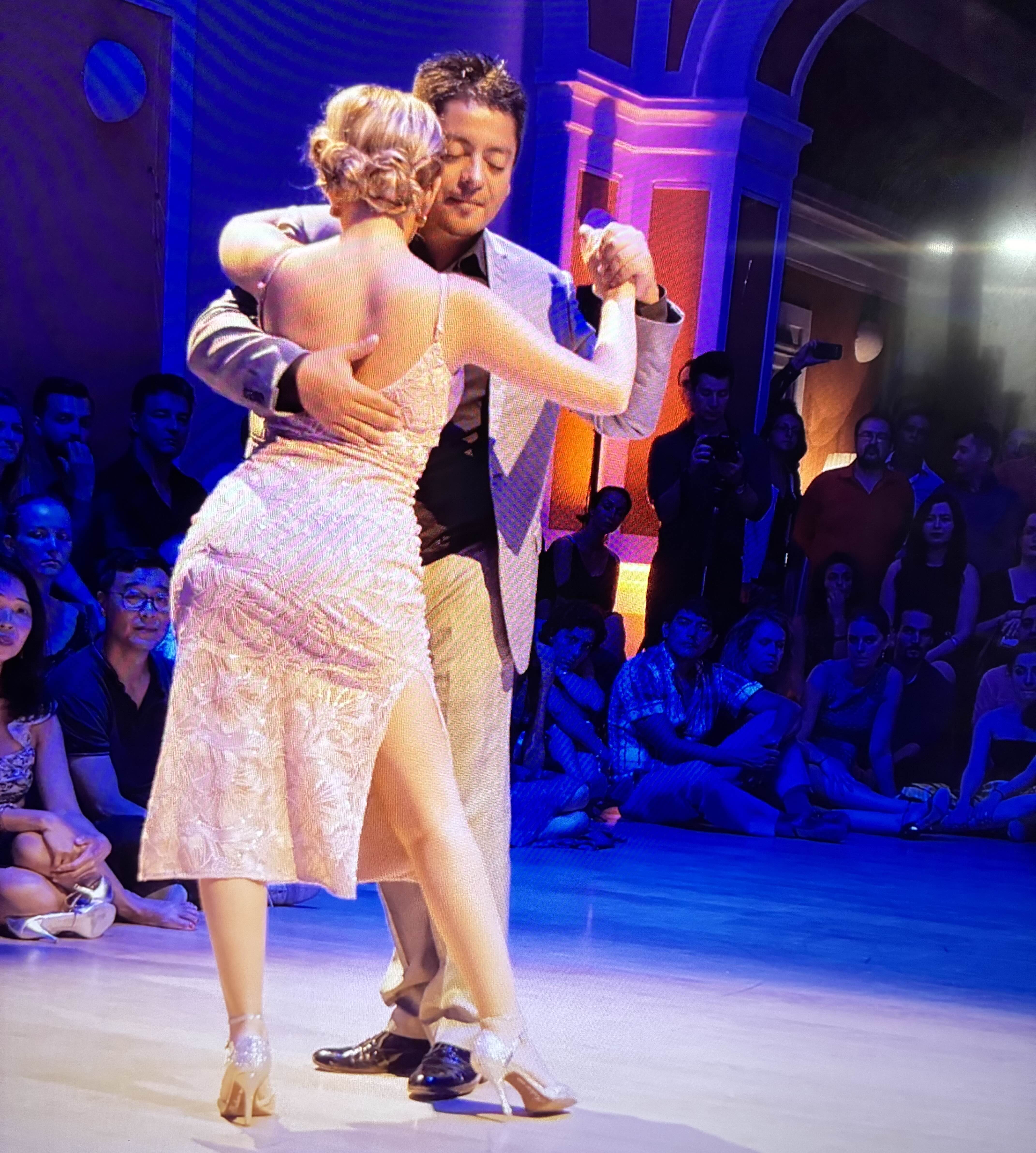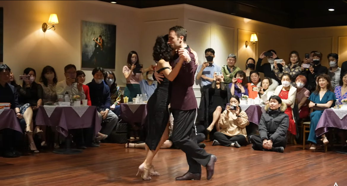 미겔 깔로(Miguel Caló)는 아르헨티나의 유명한 탱고 음악가로, 그의 오케스트라는 1930년대와 1940년대에 큰 인기를 끌었습니다. ‘Marión’은 미겔 깔로 오케스트라의 대표적인 탱고 곡 중 하나입니다. 이 곡은 1942년에 녹음되었으며, 가수 라울 이리알테(Raúl Iriarte)의 목소리로 더욱 유명해졌습니다. ‘Marión’은 감성적이고 우아한 멜로디로 많은 탱고 애호가들에게 사랑받고 있습니다.노엘리아는 아도르노와 뮤지컬리티에 천재적 재능을 가지고 있는 것 같습니다. 오른쪽 발끝으로 제자리에서 순간적으로 짧은 선을 긋기와 오초 후 앞볼레오까지 연결해 주는 모습 그리고 꾸밈음에서 역시 백사이드프론트를 2회 연속으로 밟고 가는 모습등이 보입니다.